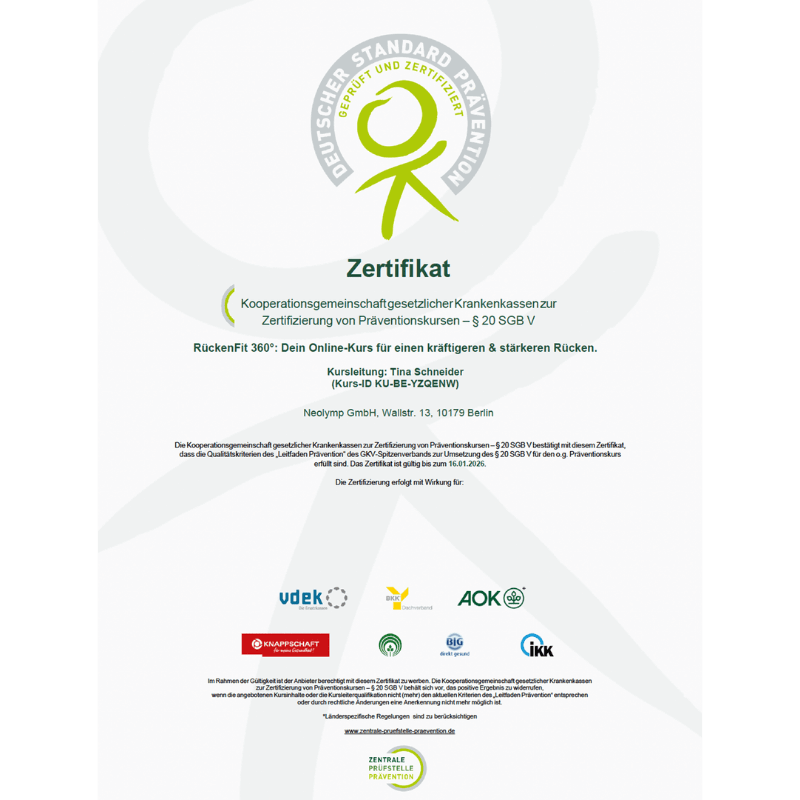 Zertifizierte Qualität: Der Kurs ist von der Zentralen Prüfstelle Prävention (ZPP) nach § 20 SGB V zertifiziert und wird von nahezu allen gesetzlichen Krankenkassen anerkannt – AOK, BARMER, DAK, IKK etc - das bedeutet, er entspricht den höchsten wissenschaftlichen und qualitätsbezogenen Standards.